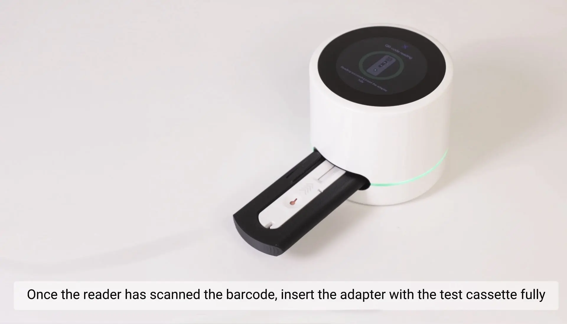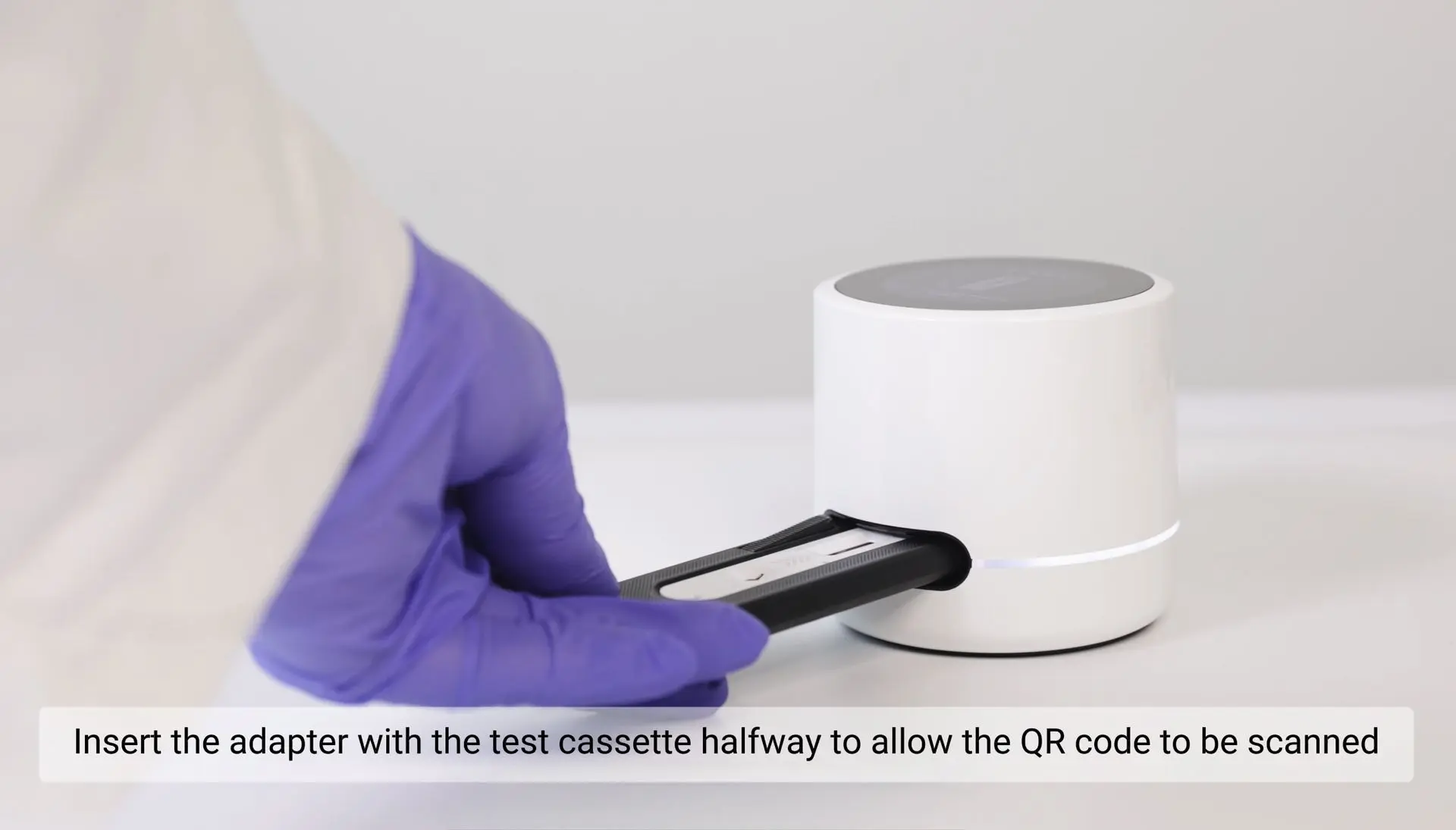 Insert the test cassette halfway into the reader to enable QR code scanning. Wait until the reader completes the scan and the green indicator light turns on.