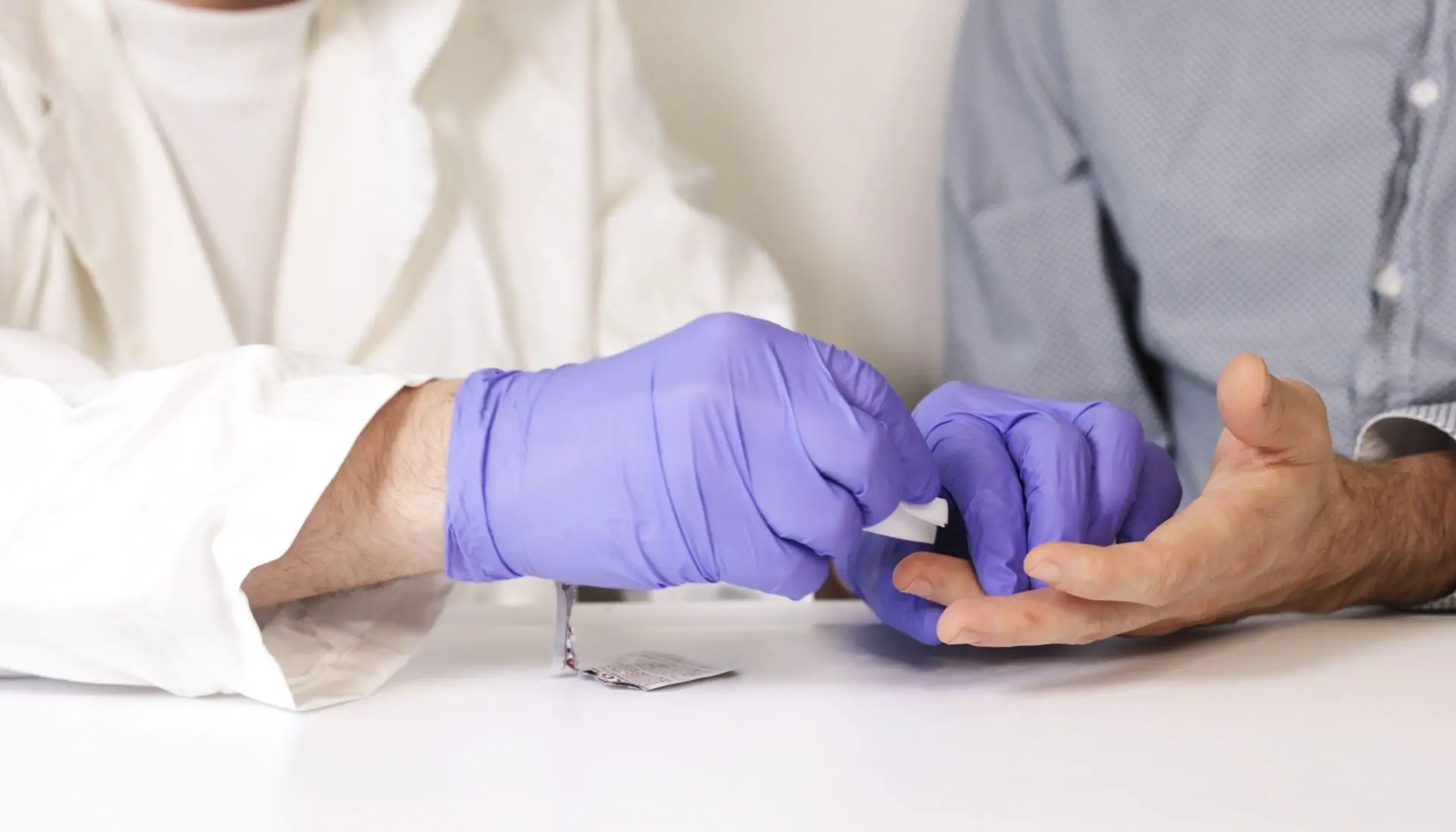 Lay out all kit components. Disinfect the fingertip with the alcohol swab and let it dry.