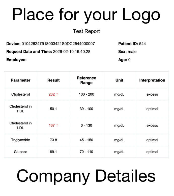 We generate custom, branded PDF reports for each partner. Your device serial number is linked to your own report design — so every report automatically comes out with your logo and details.