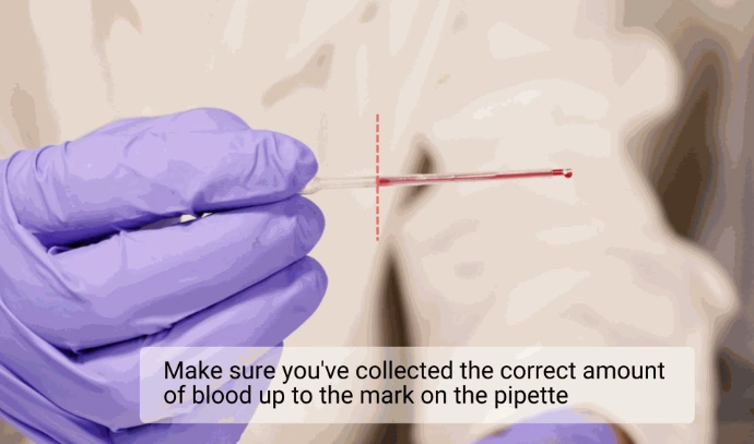 Gehen Sie vorsichtig mit der Pipette um. Verwenden Sie nur den oberen Teil, wenn Sie Flüssigkeit aufziehen oder abgeben. Vermeiden Sie es, zu fest zu drücken, um ein genaues Volumen sicherzustellen und Luftblasen zu vermeiden. Das Blut sollte bis zur schwarzen Linie auf der Pipette entnommen werden.