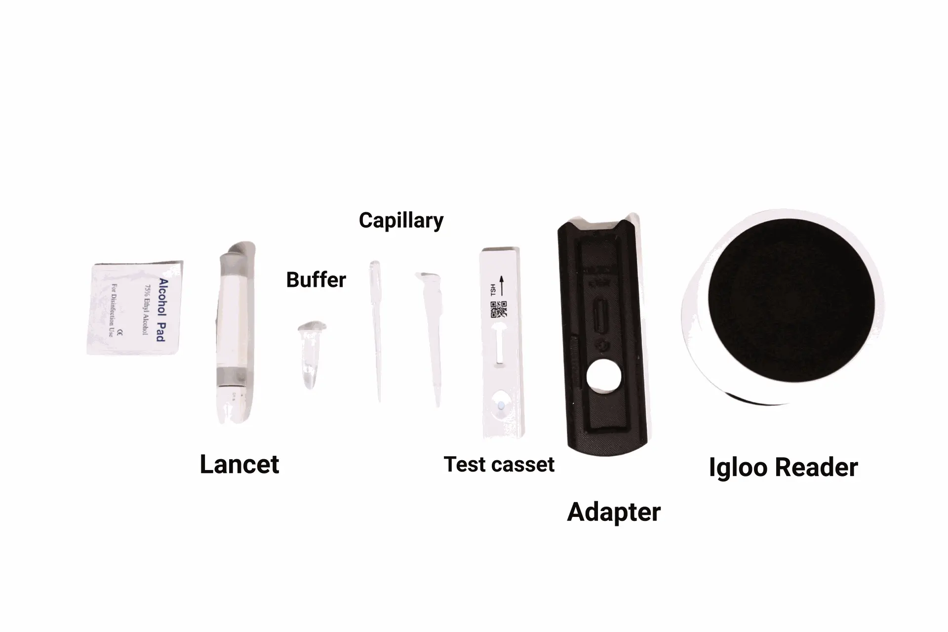 Lay out all kit components. Disinfect the fingertip with the alcohol swab and let it dry.